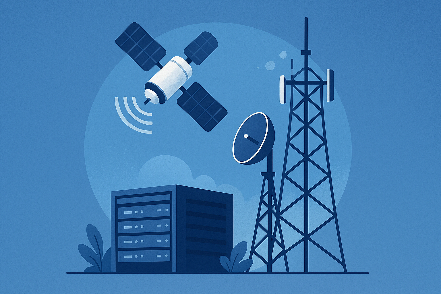 Illustration showing a satellite, communication tower, and data center representing global AI infrastructure connectivity.